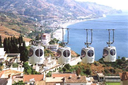 La località marina Mazzarò collega Taormina con una funivia. Quattro cabine sono sospese a un'altezza di 30 metri permettono di raggiungere il monte in 2 minuti. Nei mesi d'estate questa funivia viaggia anche di notte.